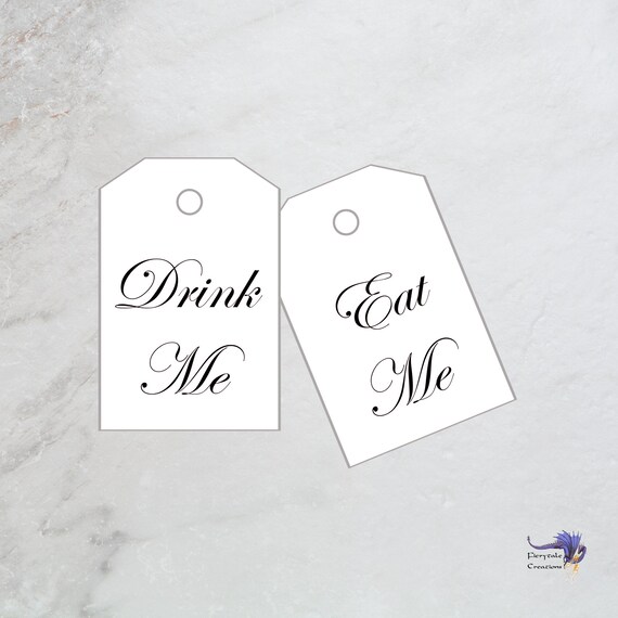 Printable Alice's Adventures in Wonderland Tags, Vintage Eat Me, Drink ... Approx. 2.5"x1.5". Files come in both Letter paper & A4 paper size, with 12 Tags on each (in JPG and PDF format). Easy to use, download the files, print, cut, use the tags however you wish and print as many as you want. .................................................................................................................... Drink Me Labels - Etsy Set of 30 "Drink Me and Eat Me" Primitive Alice In Wonderland Mini Tags-Printable Collage Sheet JPG Digital File thephotocube (7,757) $1.50 Alice in Wonderland Printable Water Bottle Labels Set: Drink Me, This one Makes you Smaller, This One Makes you Talller INSTANT DOWNLOAD HunnyPrints (9,403) $5.00 DRINK ME! Free Alice in Wonderland Labels & Tags • Curt R. Jensen 29 October 2019 Included in this FREE PDF are Wonderland-inspired "Drink Me" and "Eat Me" tags, bottle and bottle cap labels, and belly bands to wrap around cakes or candy bars. All of this printable goodness is available in six different colors, so you can coordinate them with your own Alice in Wonderland themed party decor!
